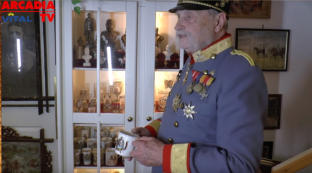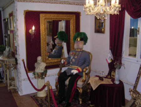 begrüßt Kaiser Franz Josef auf einem Stuhl